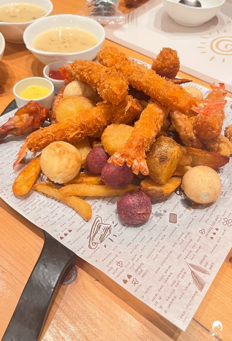 這盤鮮蝦爆炸綜合炸物 (六人份)一上桌,大家立刻發出哇~~的驚嘆!裡面不僅有炸鮮蝦、雙色QQ球、美味起司球還有薯條以及炸馬鈴薯,真的太膨湃啦 ٩(๑> ₃ <)۶з