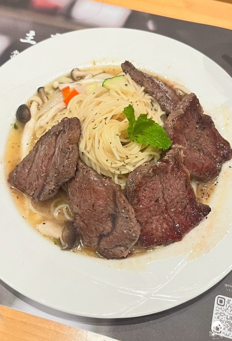 愛吃牛肉或牛排的你,應該也會很喜歡這道炙燒蒜香牛排天使細麵,炙燒蒜香牛排吃起來很軟嫩又好入口,肉質很棒也很彈牙,搭配清爽醬汁及天使細麵好對味,這是一道吃完還會讓人不停回味的美味餐點੭ ˙ᗜ˙ )੭