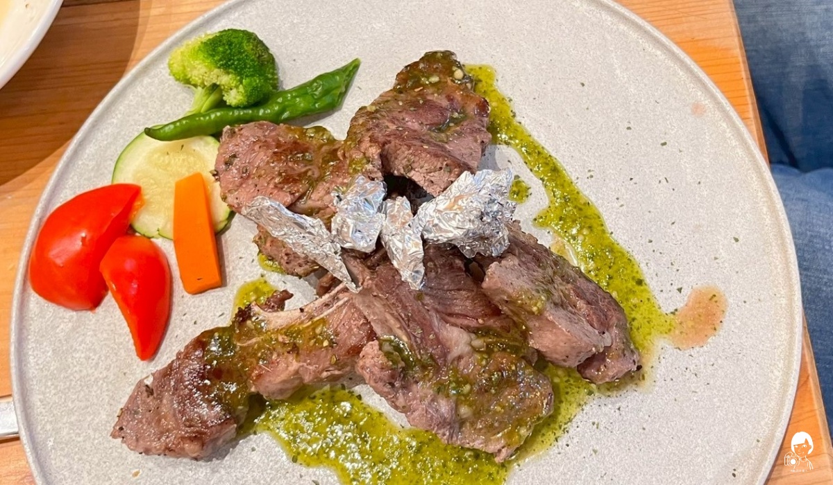 羊肉吃起來很軟嫩,也不會有讓人還怕的羊騷味,吃這道排餐時,可以搭配旁邊的季節時蔬一起享用,美味會加倍,記得也可以搭配旁邊的醬汁一起吃。