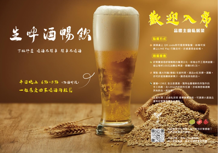 好果實現在啤酒也有【暢飲生啤酒】活動,這是個平日限定的優惠活動,從晚上六點到八點(最後加點時間),只要 $399 就能無限暢飲囉~讓辛苦忙碌的上班日常,在下班後也能來個微醺小確幸:)
