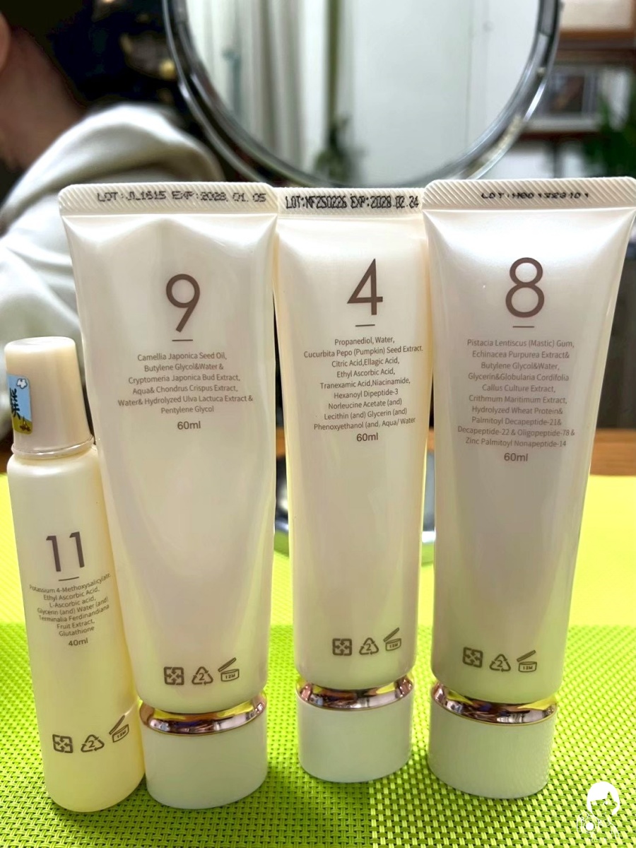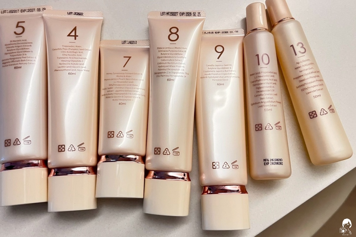 關於我的保養步驟:先滴10→接著在滴13,然後將編號 4+5+9+13 混合成保養液擦和厚敷在臉上,最後再補 7 號眼霜,就完成簡單又省時的保養程序囉:)