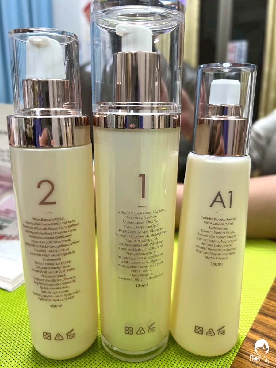 ▼做臉當天美容老師先幫我進行臉部的洗卸和化妝水溫和保養,使用的是【A1淨透煥彩卸妝油、1清透淨化潔顏露、2平衡水樣柔膚露】,洗臉的過程可以感受到保養品很溫和,保養品的質地很親膚又好推開~